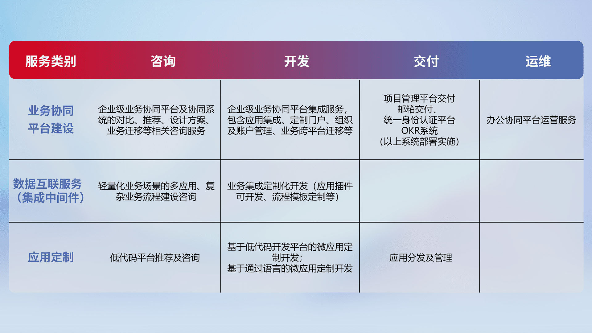 针对钉钉、、、、企微、、、、IDaas等平台级产品提供产品的规划、、、方案、、、、交付、、定制化开发等服务,,实现如统一协同办公、、智能客户服务、、混合会议管理、、、、智能数据查询、、、等业务场景,,,实现数字化转型。。。