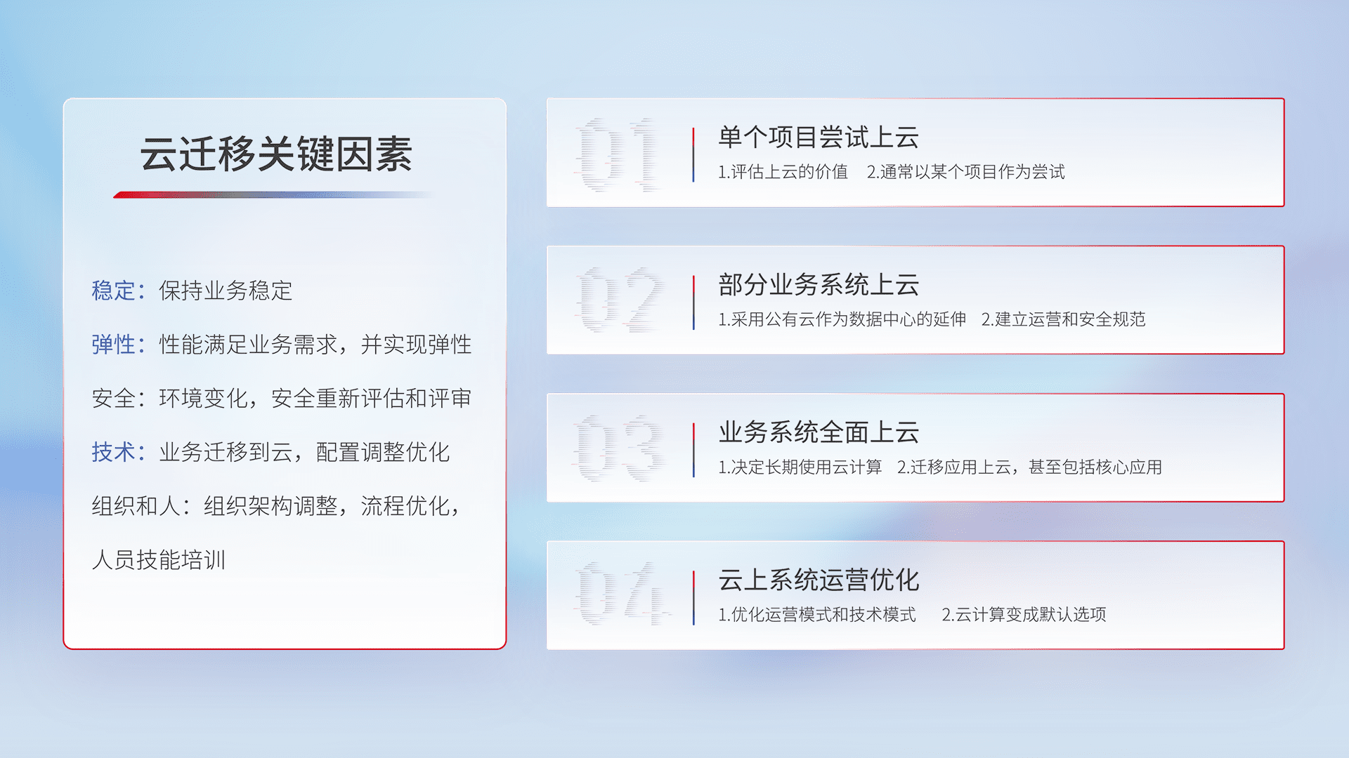 结合实际业务,,从规划设计、、、云平台选型、、、、云原生改造、、数据迁移、、、、集成交付,,迁移全过程为客户识别最佳上云路径,,做好风险识别管理,,设计网络架构、、、、身份权限、、、、安全审计合规、、操作审计、、日志审计、、、、监控告警策略、、、、多站点容灾设计等,,,对云上基础设施进行整体规划,,,提升IT治理水平,,,,以满足弹性、、高可用、、高性能的需求。。。。