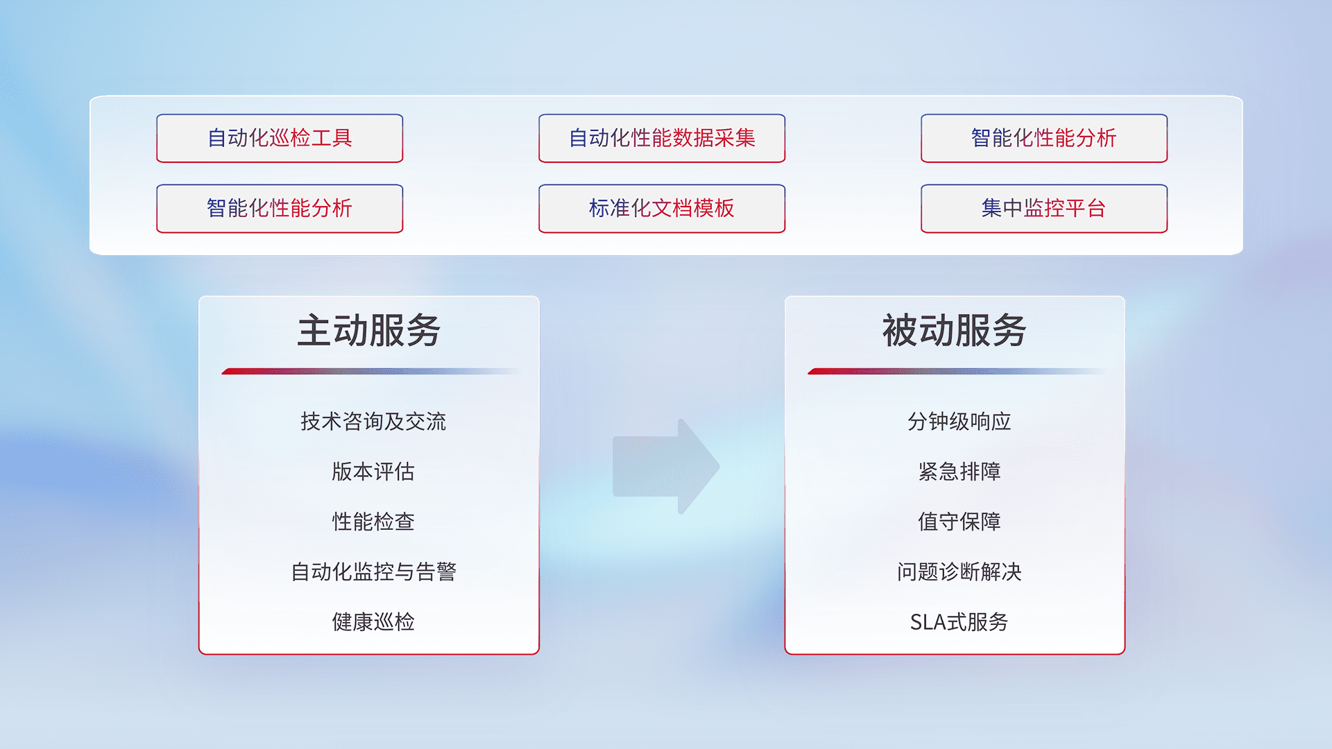 智能化工具和标准化文档,,,保障服务质量,,,,提供主动服务(包含技术咨询、、版本评估、、、、性能检查、、、、自动化监控与告警、、、、健康巡检)和被动服务包含(分钟级响应、、、紧急排障、、值守保障、、、问题诊断解决、、、SLA服务)。。。